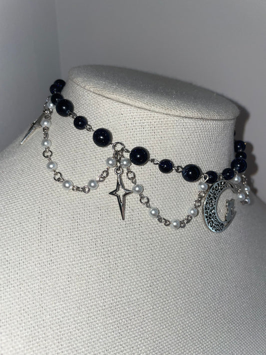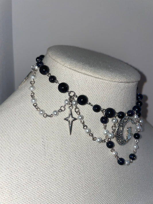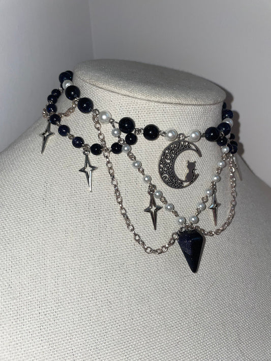 Cat on the Moon Choker w/ Purple Goldstone Pendant